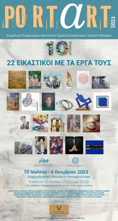 Το Σωματείο Πτυχιούχων Ανωτάτων Σχολών Εικαστικών Ηπείρου και η Εφορεία Αρχαιοτήτων Θεσπρωτίας, τη Δευτέρα 10 Ιουλίου 2023 και ώρα 20.30, εγκαινιάζουν στον χώρο του Αρχαιολογικού Μουσείου Ηγουμενίτσας την περιοδική έκθεση PORTaRT 2023, η οποία αποτελεί συνέχεια των ομότιτλων εκθέσεων που παρουσιάστηκαν με επιτυχία στον ίδιο χώρο το 2017 και το 2019 αντίστοιχα.